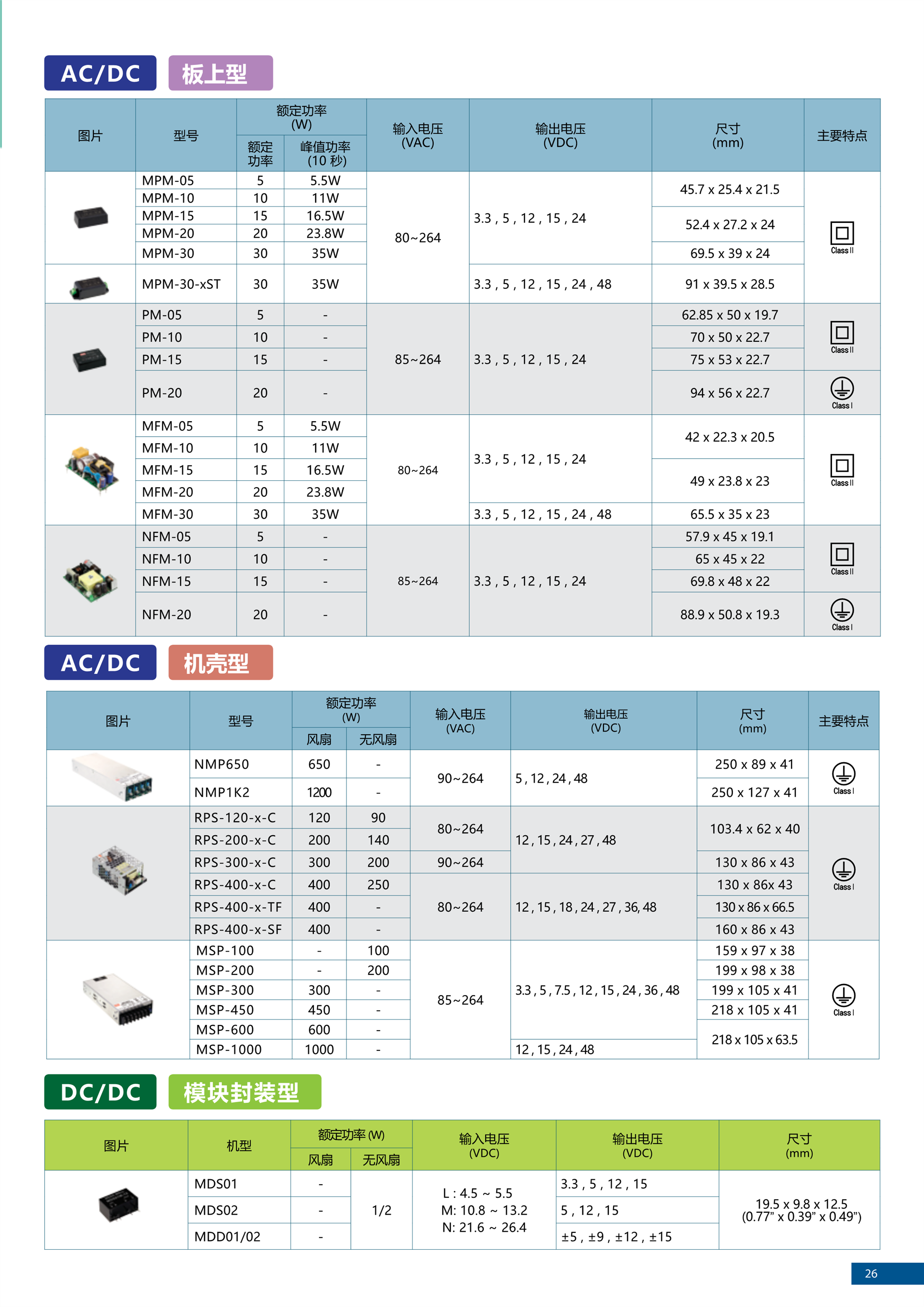 明纬医疗电源full产品有70多个系列和400多种型号供客户选项,遮盖5〜1200w,提供3〜55V单/多种输出电压。致力于绿色医疗电源的开发,并合乎国际能效等级Levelvi。